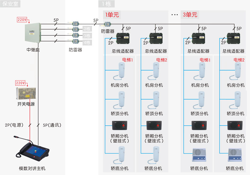基于總線制傳輸方式,專用于小區(qū)保安室、監(jiān)控管理中心與電梯轎廂、電梯控制機房、電梯轎頂、電梯轎底之間的求助報警、對講等的電梯五方對講系統(tǒng)。專用于電梯場所的五方呼叫、對講。